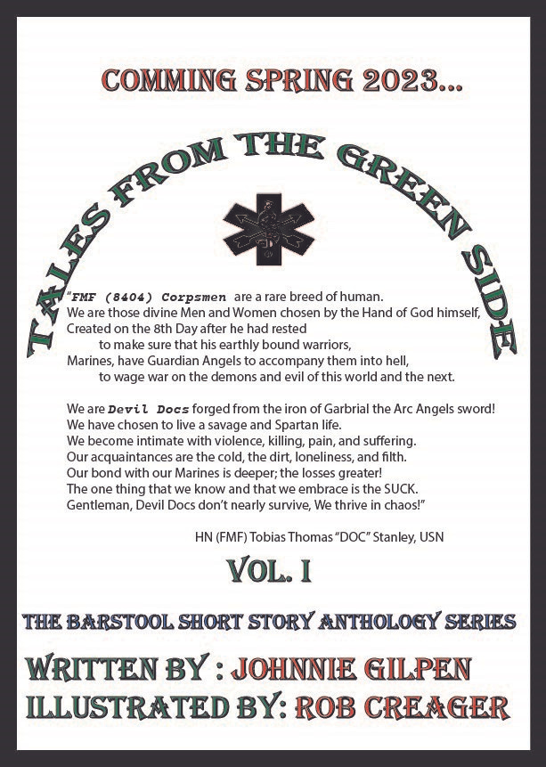 This past month we have finished two more chapters and we hope to have Tales from the Green Side to the editors by May 1st. Check out the drawings below and some of the promotional quotes from HN (FMF) Tobias Thomas Stanley and LCpl Frankie the Freak!