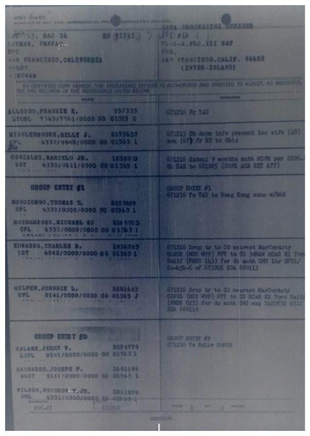 Jerry Calame provided the answer that I was not expecting, he said that every Marine in Vietnam knew that your life expectancy was longer with the Wing than it was with the infantry, hence the difficulty getting an aviation billet. However, HMM 363, a Marine helicopter air asset whose primary mission was flying medivacs at the time unexpectedly needed a large, urgent influx of non-aviation MOS enlisted replacements. When Jerry got to the unit, he learned the need was due to casualties and KIAs from recent mortar attacks. Jerry told me that my dad was one of four enlisted Marines from the Administration shops (S-1/S-2/S-3/S-4) who served as door gunners on the helicopters who survived the attacks. Jerry told me that he knew that two of the others were KIA’s at some point later and was not sure what happened to the Staff Sergeant. He told me Dad rotated home not long afterward. That explained a lot. Not only why nobody recognized my dad in the pictures, but it explained why my dad never spoke of his time in Vietnam. It also told me a lot about why Dad was the way he was. Now I knew why my dad had tried so hard to deter me from enlisting, he was trying to save me from having to experience the soul-crushing experience of seeing your brothers or sisters die in front of you. Now I know why - Survival Guilt is a bitch! I wished I had asked more questions. Ironically, the document that I received from Kip B. that showed my dad leaving Vietnam, also had Jerry and the Staff Sgt he had told me about on it as well going on a four-day R & R - that was how I got the Staff Sgt’s name. I did track him down. He had retired from the Corps as a Master Gunnery Sergeant, unfortunately, he died in 1989. Why do we write…